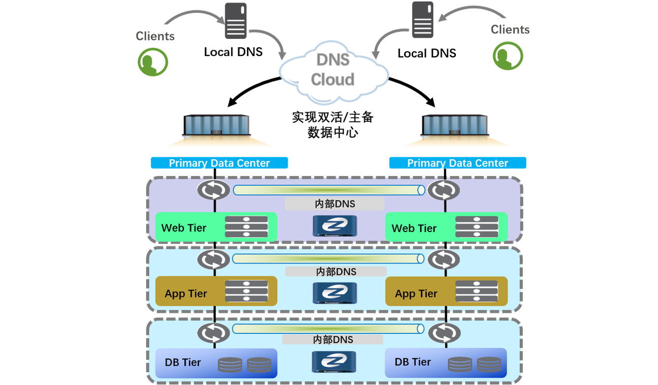 数据中心为提高应用系统的可靠性,实现多站点资源分布式部署,提高资源的利用率,需要多站点的应用系统构建成多活或主备工作模式。为了与IP地址解耦,通常会使用域名系统(DNS)来调度这些应用。凯发k8国际多数据中心域名(DNS)解决方案以IT整体架构为蓝图,以业务陆续在性保障为目标,利用域名解析门户应用调度功能,可将用户访问流量引流到可靠、可用的数据中心进行访问,既能保证用户的使用体验,又能达到应用容灾的无感切换的目的。